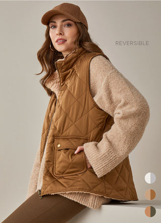 Discover the versatility of this vest! This lightweight and reversible quilted vest features patch pockets and a soft, sherpa-lined interior. With its easy fit and hip length silhouette, it's the perfect addition to any outfit. Made from 100% polyester, it can be worn in multiple ways for endless style possibilities.