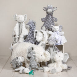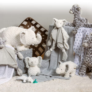 Today’s modern parent has embraced neutral color schemes for baby’s nursery. Afrique Boutique features neutral grey and white fabrics in textures we love. New for 2017 are several more toys in white and a lion character that warms up with an earthy tan. The expanded palette makes Afrique Boutique work even better with wood floors and accessories.