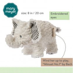 10″ long, 5″ high musical elephant made from beautifully soft, textured plush. Wind up to play, “Minuet No. 1” by Bach. Embroidered eyes. Light grey and white striped ear liners. Surface wash. Air dry.