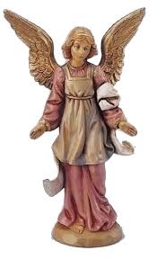 This angel figure features flowing robes, outstretched arms, and detailed golden wings. The soft pink gown is accented with a golden sash, and the angel holds a scroll, symbolizing divine messages. A timeless addition to any 5" scale Fontanini nativity.